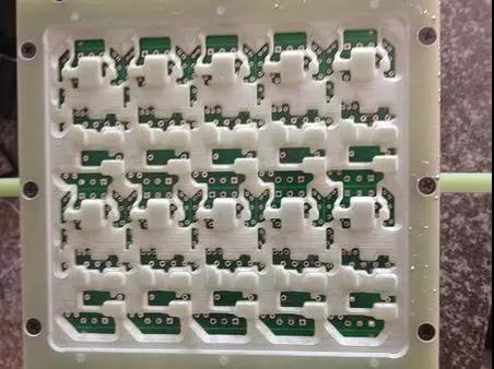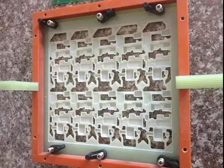 圖二的治具上面有一些孔和槽:孔是需要進(jìn)行后焊的位置,插件料的管腳可以從這些孔里面穿出來(lái),把治具放到錫爐上面時(shí),只有這些孔的位置可以接觸到焊錫;槽對(duì)應(yīng)的是PCB貼片后各種元件,元件大的就挖大點(diǎn),元件小的就挖小點(diǎn),這樣貼好貼片元件的PCB板就可以平整的放在治具上面。