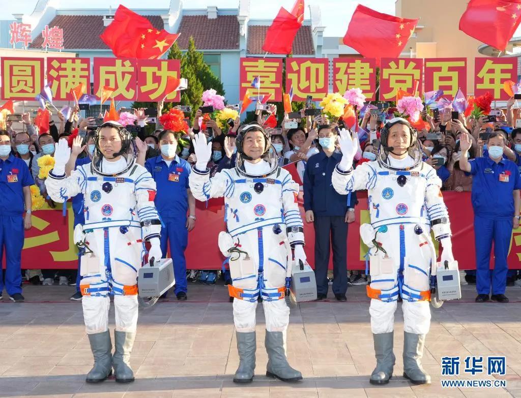 6月17日,神舟十二號(hào)航天員出征儀式在酒泉衛(wèi)星發(fā)射中心舉行。這是航天員聶海勝(右)、劉伯明(中)和湯洪波在出征儀式上揮手。