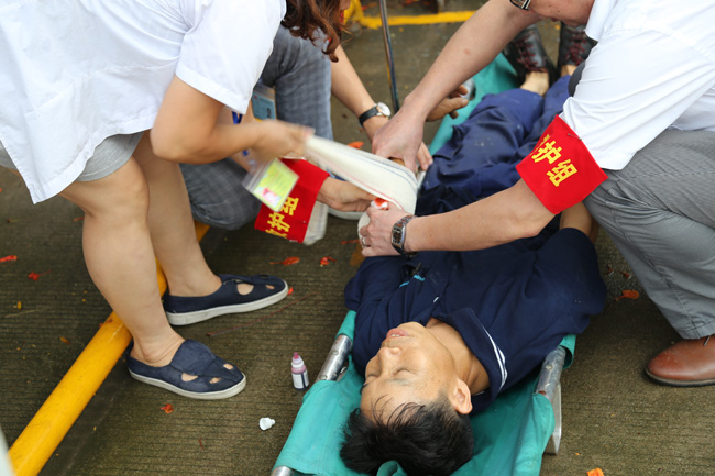 救護組對傷員傷口進行包扎處理
