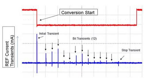 圖1顯示典型12位SAR ADC基準(zhǔn)終端上的轉(zhuǎn)換階段期間的電流瞬變。