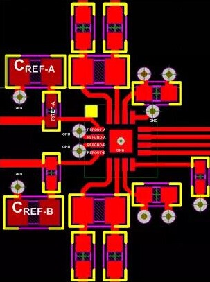 在這個(gè)四層PCB線路板示例中,設(shè)計(jì)人員使用了一個(gè)位于器件正下方的堅(jiān)固接地平面,并且將線路板劃分為模擬和數(shù)字部分,以使敏感輸入和基準(zhǔn)信號(hào)遠(yuǎn)離噪聲源。他用10μF,X7R級(jí),尺寸0805的陶瓷電容器 (CREF-x)來旁路REFOUT-A和REFOUT-B基準(zhǔn)輸出,以實(shí)現(xiàn)最優(yōu)性能,并且將他們連接至使用小型0.1 ?串聯(lián)電阻的器件上,以保持總體低阻抗和高頻時(shí)的恒定阻抗;他還使用寬跡線來減少電感。