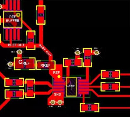 我強(qiáng)烈建議把CREF與ADC放置在同一層上。你還應(yīng)該避免在基準(zhǔn)引腳和旁路電容器之間放置導(dǎo)孔。ADS7851的每一個(gè)基準(zhǔn)接地引腳都具有一個(gè)單獨(dú)的接地連接,而每個(gè)旁路電容器都有單獨(dú)到接地路徑的電感連接。