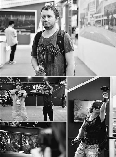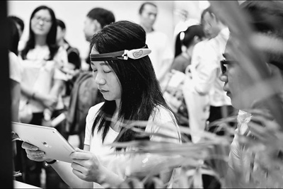 圖一為拼版照片,其中上圖是來(lái)高交會(huì)參觀的外籍觀眾;左中、左下、右下圖是在高交會(huì)上拍攝的各類VR游戲。圖二為一名觀眾體驗(yàn)智能頭帶。這款智能頭帶可以感受使用者腦電波,通過(guò)采集注意力放松和集中時(shí)不同的腦電波驅(qū)動(dòng)游戲。