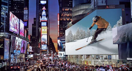 去年11月,一塊總面積2300平方米的LED屏幕在時代廣場萬豪酒店的外立面上投入使用。這塊8層樓高,幾乎有一個足球場長的巨屏從45街橫跨至46街,占據(jù)了一整個街區(qū),設(shè)備測試時讓路過的行人目瞪口呆。