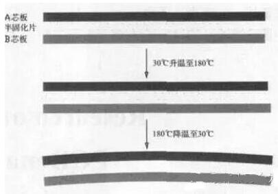 此時由于半固化尚在自由狀態(tài),兩種芯板一長一短,互不干涉,尚未發(fā)生變形。