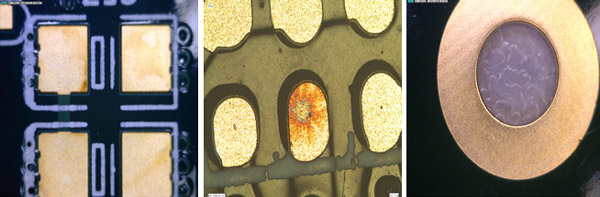 1、操作不當致使污染物附著在金表面,例如:帶不干凈的手套、指套接觸金面、金板與不干凈的臺面、墊板接觸污染等;此類氧化面積較大,可能同時出現(xiàn)在相鄰的多個焊盤上,外觀顏色較淺比較容易清洗。