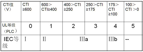 相比漏電起痕指數Comparative Tracking Index (CTI):材料表面能經受住50滴電解液(0.1%氯化銨水溶液)而沒有形成漏電痕跡的最高電壓值,單位為V。