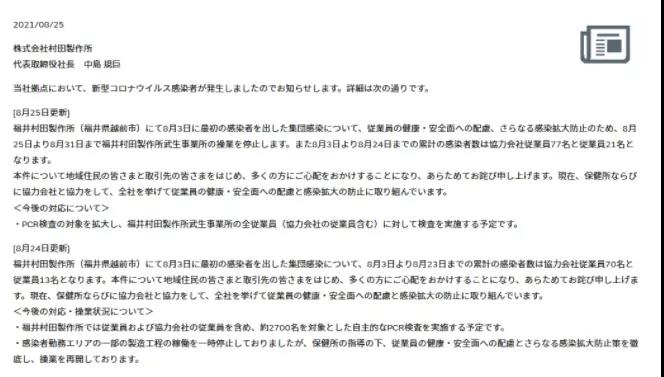 據(jù)PCB小編了解,福井廠為村田最大單一廠區(qū),合計(jì)占村田MLCC產(chǎn)能比重約達(dá)25,網(wǎng)站信息顯示,該公司有4090員工。這一波疫情沖擊,也是村田首度有工廠停產(chǎn)。