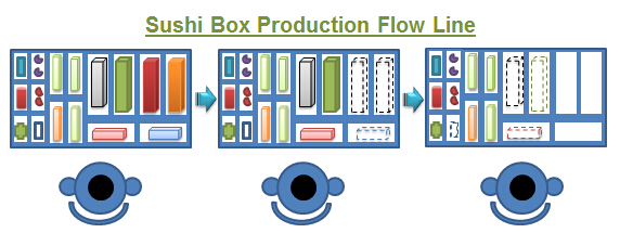 這個(gè)壽司盒被設(shè)計(jì)成可以容內(nèi)一整臺(tái)產(chǎn)品的所有零件于其中,也就是必須有專人在物料區(qū)先把一整臺(tái)產(chǎn)品的所有零件預(yù)先放置于壽司盒中,然后再由水蜘蛛將這個(gè)壽司盒放至于產(chǎn)品組裝生產(chǎn)線的流線上,通常會(huì)設(shè)計(jì)一個(gè)有滑輪的斜臺(tái)面,讓壽司盒可以隨著產(chǎn)品的組裝的流動(dòng)而跟著滑動(dòng),每個(gè)作業(yè)員按順序拿取壽司盒內(nèi)的零組件,然后安裝產(chǎn)品,當(dāng)產(chǎn)品組好壽司盒內(nèi)的零件也剛好用完。