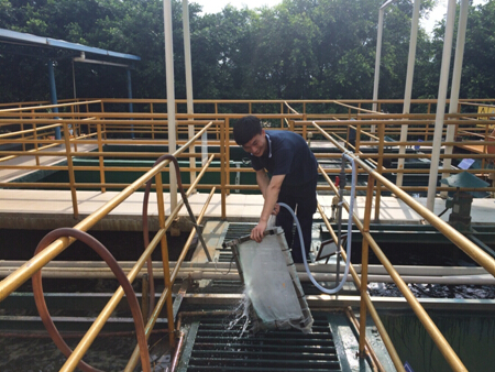 現(xiàn)場采訪正值晌午,烈日當(dāng)頭,燥熱的天氣也讓我沒走幾步就汗流浹背!到了環(huán)保池,看見我們的環(huán)保組長國國正在沖刷過濾網(wǎng)。其實跟國國也算老相識了,見到我,他笑了笑,打了個招呼,埋頭繼續(xù)手中的工作。