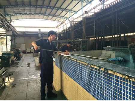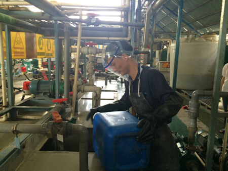 我問國國每天得在這上面工作多久,他頭也不抬的回答我:三個小時吧!老天,我來這一會就覺得燥熱難耐,可是他們需要在這上面連續(xù)工作三個小時!在完成水池上的工作后,他又馬不停蹄地趕往廢水處理區(qū)配藥、撈油墨、清理不可回用水里面的泥巴。國國說每天最累的就是清理不可回用水的泥巴,這是純體力活,工作強(qiáng)度特別大!不僅每天把自己弄的臟兮兮的,而且比在回用水池上更熱,每天弄完這些整個人就跟水洗了一樣!另外就是配藥,每天都會跟硫酸、氫氧化鈉這些強(qiáng)腐蝕性的的藥品打交道,國國配起藥來也是輕車熟路。我問有沒有覺得這些藥水很危險?他笑了笑,說在環(huán)保部呆了好多年了,只要自己穿戴好勞保用品,嚴(yán)格按照標(biāo)準(zhǔn)流程作業(yè),就不會發(fā)生事故產(chǎn)生危害。