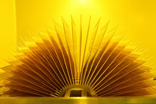接下來的步驟,讓我受到了超市新鮮食品封裝般的待遇??吹较旅婺前衙利惖纳茸記],親,瞪大眼睛瞧仔細(xì)咯,那絕對不是把扇子,那是我們幾十個(gè)小伙伴們一起組成的。經(jīng)過一個(gè)自動貼膜的機(jī)器,我們被貼上了一層薄薄的感光膜,這個(gè)膜可以是后面線路板曝光的關(guān)鍵介質(zhì)。我想說,千手觀音是藝術(shù),我們這個(gè)也至少算是門技術(shù)吧……