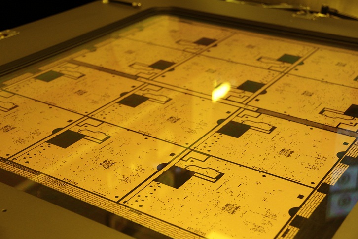 被貼完膜的我,像“小鮮肉”一般HOLD不住了,接下來是美圖拍拍時(shí)間,也就是線路板外層線路最重要的一個(gè)流程----曝光。只見曝光機(jī)上下被固定了兩片黑色的菲林,然后線路板廠的大哥把我送到兩片菲林中間,機(jī)械關(guān)閉這幾秒鐘簡直亮瞎了我的眼。強(qiáng)光將菲林上的線路曝光在我身上,我的眼前一片黑白,閃過一張像地圖般復(fù)雜的線路圖,隨后機(jī)械開了,明亮的燈光照在我身上,終于我看清了自己的新造型。