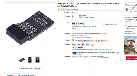 隨著Windows 11正式發(fā)布,不少人開(kāi)始在網(wǎng)上炒TPM 2.0模組的價(jià)格。Windows 11公布沒(méi)多久后,eBay上某公司的TPM 2.0模組從24.9美元硬生生拔高至99.9美元。