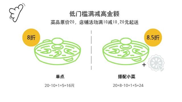 A2:不妨我們倒過來推算,先根據(jù)區(qū)域內(nèi)的競爭情況決定滿減力度,然后再用成本計(jì)算法,反算菜品定價(jià),這樣既保證了利潤,優(yōu)惠吸引力也在。