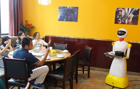 大家也許跟小編一樣好奇,機(jī)器人服務(wù)員是靠什么走動(dòng)呢?細(xì)心的童鞋也許發(fā)現(xiàn)了,餐廳地上有一條細(xì)細(xì)的黑線,這才是“服務(wù)員”們走路的軌跡,她們沿著這條軌道前進(jìn),到達(dá)顧客所在的位置時(shí),才會(huì)自動(dòng)停下,提醒顧客取用。這不?這一桌的顧客們看到這一身扮相及服務(wù)周到的“美女服務(wù)員”,都果斷路人轉(zhuǎn)粉,紛紛拿起手機(jī)按快門了。