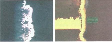 De-smear只要不超過(guò)0.3mil Etch back(回蝕)即可,一般而言除膠渣程度控制是以咬蝕量為主要指標(biāo),如果咬蝕暈穩(wěn)定但仍然有殘膠質(zhì)量問(wèn)題,則可能有兩種狀況:其一是膠渣確實(shí)未清干凈,來(lái)自于過(guò)多不良鉆孔產(chǎn)生的殘膠。其二是膠已清除,但沾黏在孔壁未被后來(lái)的水洗清除。前者必須改善鉆孔制程,而后者則要改善水洗或強(qiáng)化De-burr的高壓水洗清潔能力。