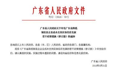 910日,廣東省人民政府印發(fā)《廣東省降低制造業(yè)支持實體經(jīng)濟發(fā)展的若干政策措施(“修訂版”)》(下稱修訂版)的通知。