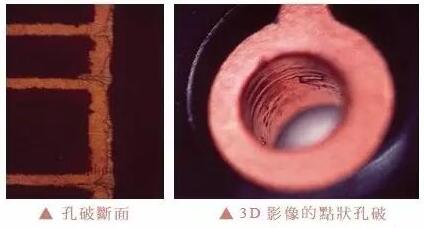 孔破狀態(tài)是點狀分布而非整圈斷路的現(xiàn)象,就稱為點狀孔破,也有人稱它為楔型孔破。常見產(chǎn)生原因,來自于除膠渣制程處理不良所致。電路板除膠渣制程會先進行膨松劑處理,之后進行強氧化劑高錳酸鹽的侵蝕作業(yè),這個過程會清除膠渣并產(chǎn)生微孔結構。經(jīng)過清除過程所殘留下來的氧化劑,就依靠還原劑清除,典型配方采用酸性液體處理。