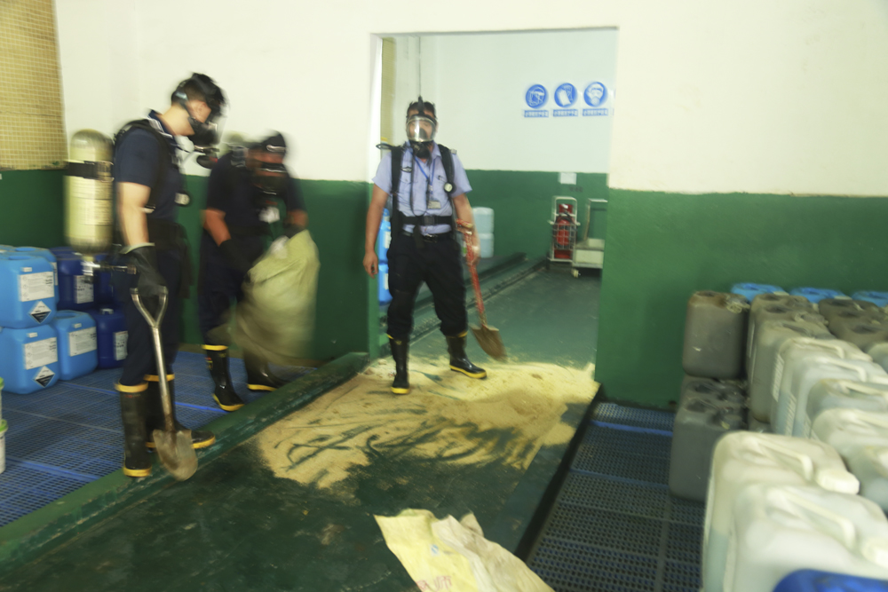 一組人員針對事故現(xiàn)場的泄漏點立即堵截,一組人員針對已經(jīng)泄漏的藥水用砂土進行收集圍堵,防止污染擴散;其它應(yīng)急搶救人員幫忙把旁邊的藥水桶挪開。