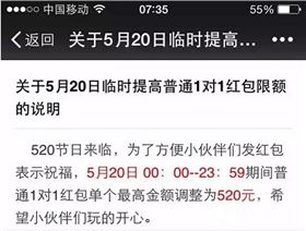 微信紅包也破了例,普通1對1紅包單個最高金額調(diào)整為520元。見證感情的時刻到了,別說微信沒給你機會。