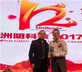 圖為深聯(lián)電路徐總手捧獎杯與洲明首席運(yùn)營官土橋先生合影