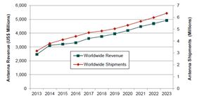 圖3:2013-2023年全球基站天線營收及發(fā)貨量預(yù)測(cè)