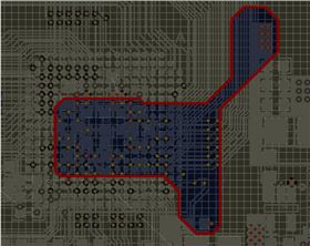 多層PCB板設(shè)計(jì)中往往要對(duì)內(nèi)電層中的電源層進(jìn)行平面分割。以本次設(shè)計(jì)為例,在LPC3250的引腳中有三種電源DP3V3、DP1v2、DP1V2PLL,由于BGA封裝的特殊性,將這三種電源引腳全部引出連接相應(yīng)的電源基本上是不可能的,因此我們需要對(duì)電源內(nèi)電層進(jìn)行分割來(lái)為每一種電源供電。