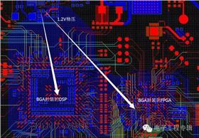 1.2V和1.8V是內(nèi)核電源(如果直接采用線連的方式會(huì)在面臨BGA器件時(shí)遇到很大困難),布局時(shí)盡量將1.2V與1.8V分開(kāi),并讓1.2V或1.8V內(nèi)相連的元件布局在緊湊的區(qū)域,使用銅皮的方式連接,如下圖: